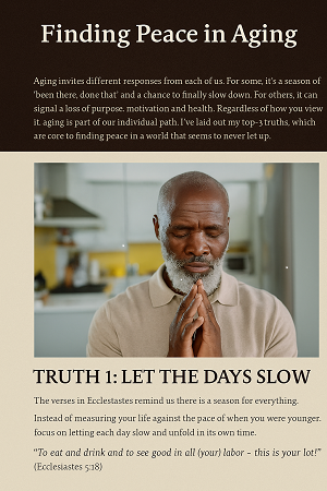 But here’s the truth: peace in aging doesn’t come from what you still have to do — it comes from accepting what already is. It’s about letting God’s plan take center stage, not our own. As I reflect on my own journey, I’ve found three timeless truths that help me stay grounded and at peace through the changes of growing older